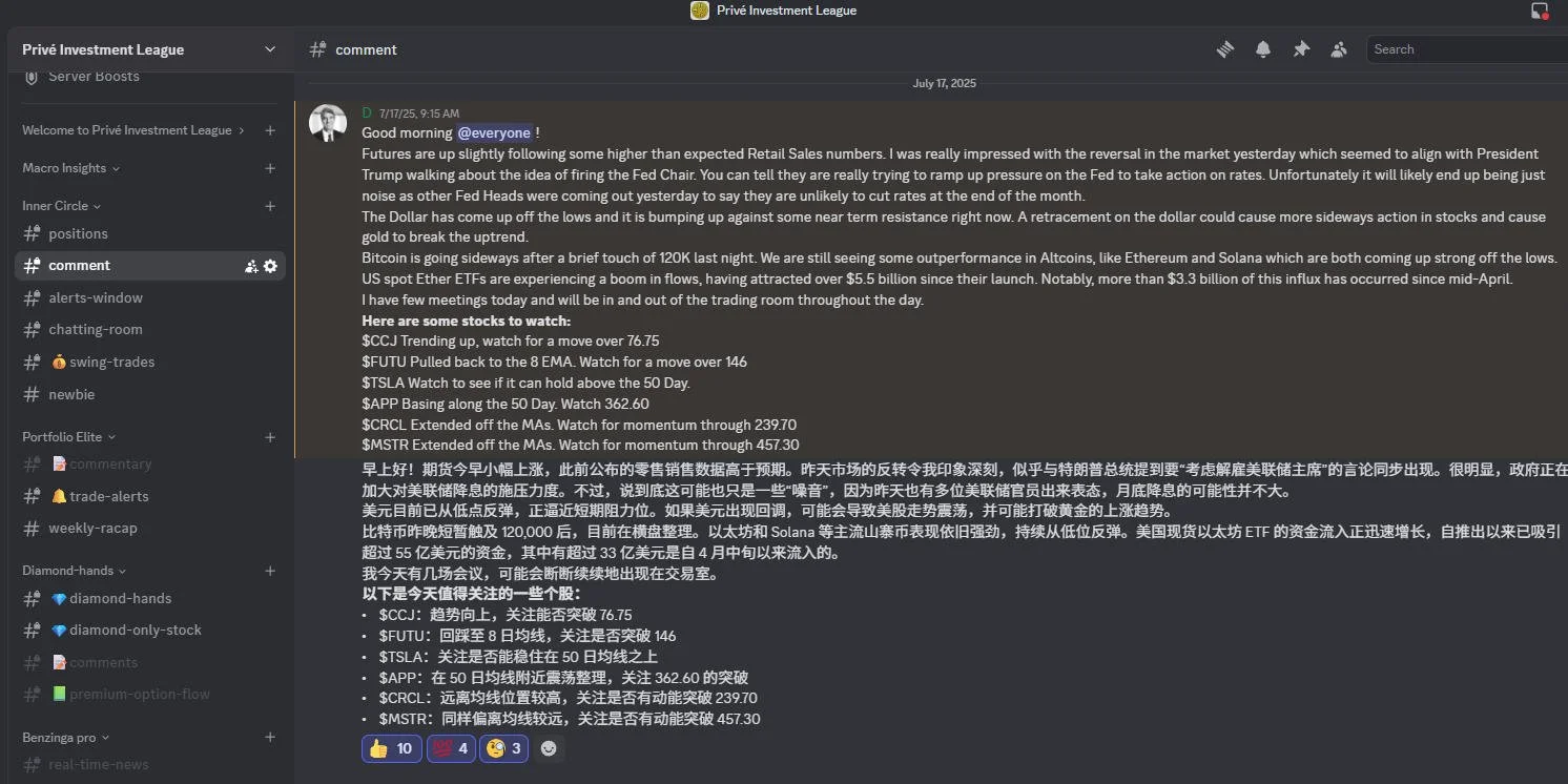 Mentors will post their daily pre-market commentary. These updates offer in-depth insights into market dynamics and are much more than just basic analysis — they reflect a deep understanding of market trends and potential shifts. Even if you choose not to follow every trade alert, reading the pre-market notes is highly recommended. They provide a strategic framework to guide your short- to medium-term trading plans. In fact, many experienced members don’t follow trades blindly; instead, they use the pre-market commentary to build their own trading game plan. Maintaining independent judgment is a key trait of a successful trader.